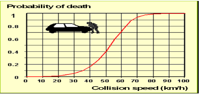 המחקרים מראים כי תוצאת התאונות עם כלי רכב ממונעים נקבעות בעיקר על ידי מהירות ההתנגשות, המראה כי הסיכוי לפגיעה קטלנית גדל משמעותית במהירויות של יותר מ- 30 קמ”ש (SWOV). הקשר שבין הסיכוי למוות ומהירות ההתנגשות בתאונות הולכי רגל חזיתיות: