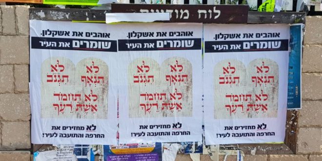 השבוע נתלו כרזות על לוחות מודעות , חלקן גם בבתי הכנסת.הכרזות – עם לוגו של לוחות הברית עליהם נכתב ‘אוהבים את אשקלון-שומרים את העיר’.על לוחות הברית נכתב : ‘לא תנאף, לא תגנוב, לא תחמוד את אשת רעך’.בשורה האחרונה נכתב:’לא מחזירים את התועבה והחרפה לעיר’