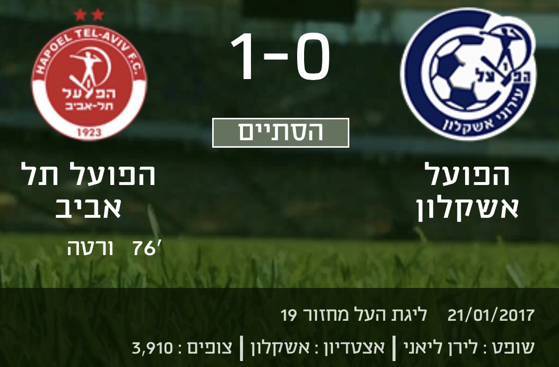 הפועל אשקלון הפסידה הערב 0:1 להפועל ת״א משער של עופר ורטה בדקה ה-76 בעקבות ההפסד, צימקו הפועל ת״א את הפער מהקו האדום לשש נקודות דבר שיכניס המון לחץ בתחתית הבוערת.