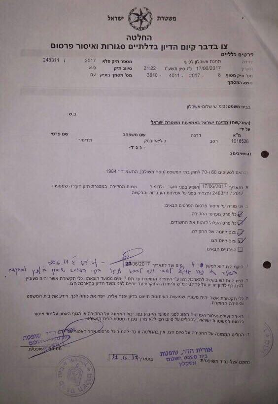 הארכת תוקף צו איסור פרסום והרחבת מגבלותיו הערב, צאת יום שבת, נעתר בית המשפט באשקלון לבקשת חוקרי המשטרה והאריך את צו איסור הפרסום בתיק מספר 248311/2017 בנושא חשד לעבירות מין, חקירה מתנהלת בתחנת אשקלון של משטרת ישראל.