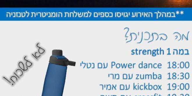 לקהילת אג’נדה מצטרפים צעירים רבים כל יום .בניהם : נוי בוזגלו שהעלתה רעיון לקיים ערב הפנינג ספורט באשקלון למען משלחת הומניטרית לטנזניה מטעם עמותת helpapp בה היא לוקחת חלק. בהתחלה הרעיון עלה באופן הומוריסטי אך בעבודת צוות של כלל חברי קהילת אג’נדה הרעיון קיבל כוח ויוצא לפועל בחוף דלילה ביום חמישי 16.8.18 בשעה 18:00-20:00. הערב מוקדש לתרומה עבור המשלחת וייקחו בו חלק מיטב מאמני הכושר בעיר. המאמנים יעבירו אימונים בתחומים מגוונים בשתי במות מרכזיות שמוקדשות לאימונים אירוביים לצד אימוני יוגה פילאטיס צ’י קונג וכו’.מתחם הפעלה לילדים ודוכנים שונים. בערב זה חברי עמותת HELPAPP יגיעו לאיסוף תרומות וכולכם מוזמנים לתת יד בעשייה למען המשלחת. משלחת helpapp מוציאה משלחות ליעדים שונים ומורכבת מכל האוכלוסייה הישראלית על כל גווניה במטרה לסייע למדינות עולם שלישי במספר רב של היבטים. נושאים מרכזיים במשלחת הם: תחום השיפוצים שכולל שיפוץ המבנים עבור בתי יתומים הכוללים שיקום כיתות, צביעה, ניקיון, גינון, כל זה בעשייה חוויתית יחד עם הילדים. תחום ההדרכה כולל לימוד תכנים בבית הספר כמו מתמטיקה, אנגלית, מוסיקה, גאוגרפיה ריקוד וספורט. וכולל בתוכו גם העברת תכנים חברתיים בלתי פורמליים בבית יתומים וכמובן החלק החשוב ביותר הם יקבלו המון חום ואהבה. במשלחת הנוכחית לטנזניה ייקחו חלק אזרחי ישראל רבים בתפקידים שונים.